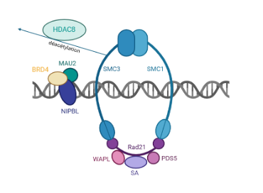 Schéma du complexe cohésine. L’anneau de cohésine est principalement formé par les protéines SMC1 et SMC3, ainsi que RAD21 et une protéine de la famille SA (STAG ou SCC3). Plusieurs facteurs régulent l’ouverture, la fermeture et la localisation de l’anneau : NIPBL et le complexe MAU2/BRD4, WAPL et PDS5. HDAC8 est une enzyme qui effectue une déacétylation de SMC3, essentielle à la stabilité du complexe cohésine.