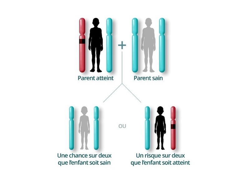 Le terme « autosomique » signifie que les personnes atteintes peuvent aussi bien être des femmes que des hommes, la maladie n’est pas liée au sexe. Le terme « dominant » signifie qu’il suffit qu’une seule copie d’un des gènes impliqués dans ce syndrome soit altérée pour développer la maladie.